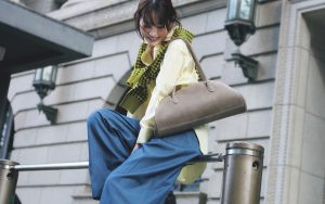 ジレ¥19,910・パンツ¥16,940(ユナイテッドアローズ グリーンレーベル リラクシング ルミネ有楽町店〈グリーンレーベル リラクシング〉) ボウタイ付きシャツ¥50,600(オブリオ) バッグ¥270,600(トッズ・ジャパン〈トッズ〉) 手に持ったストール¥15,400(マニプリ) 時計¥759,000(オメガ) ピアス¥29,700(リラ/スピック&スパン ルミネ有楽町店〈サム バイ リラ〉) ブレスレット¥71,500(ヴァーミリオン) リング¥40,700(ヴァンドームヤマダ〈ケンゴ クマ プラス マユ〉)