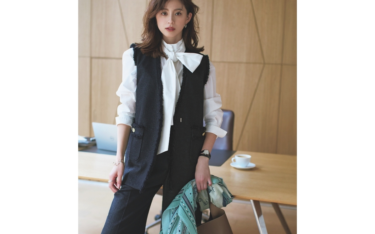 堅苦しくなく、モードな洒落感が漂うツイードのジレセットアップ。ボウタイブラウスと相性抜群。