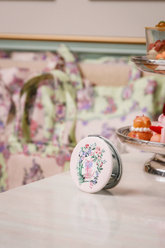 コラボレーションアイテムを¥10,000(税込)以上予約した方に、ノベルティのコンパクトミラーをプレゼント。可憐なピンクにマカロンのデザインで仕上げた、持ち運びにも便利なアイテムです。