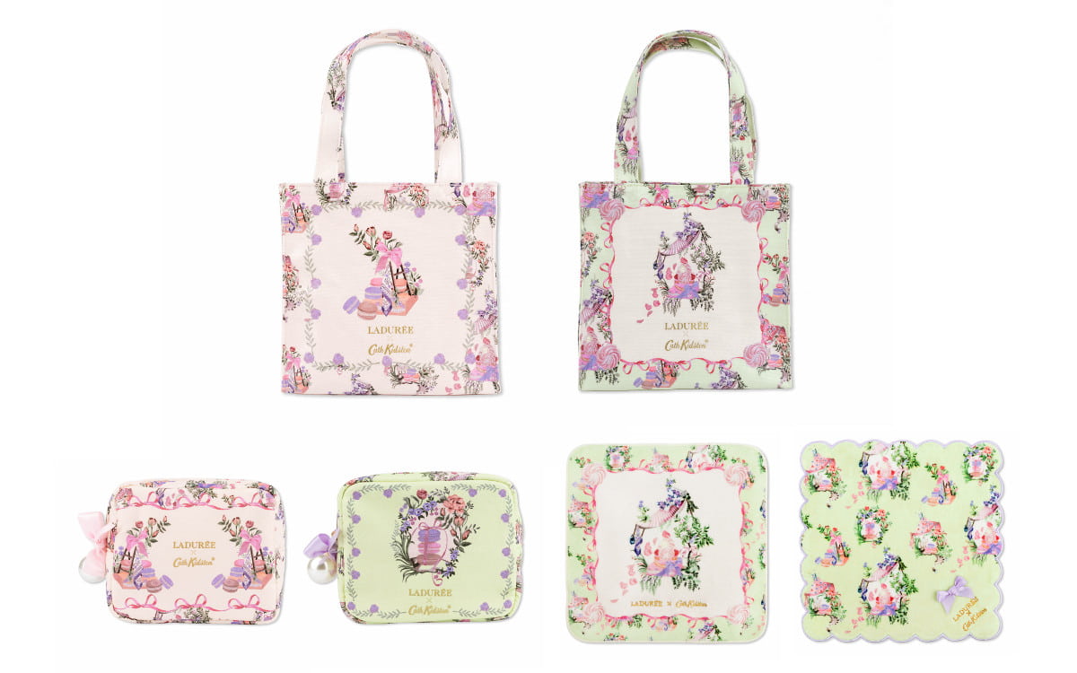 キャス キッドソンの定番人気アイテム「ブックバッグ」のスモールサイズが特別なデザインでお目見え。コットンにコーティングを施すことで、光沢のある質感がエレガントな雰囲気を引き立て、汚れてもさっと拭き取れる実用性もプラスされています。表裏で異なるアートを配し、アイボリーにはマカロン、ミントグリーンにはラデュレのアイコニックなパティスリー サントノレを主役にしたデザインと、片面は共通でラデュレの芸術的なスイーツが⽊々の枝々に抱かれた草花とともに美しく佇む物語のような柄になっています。