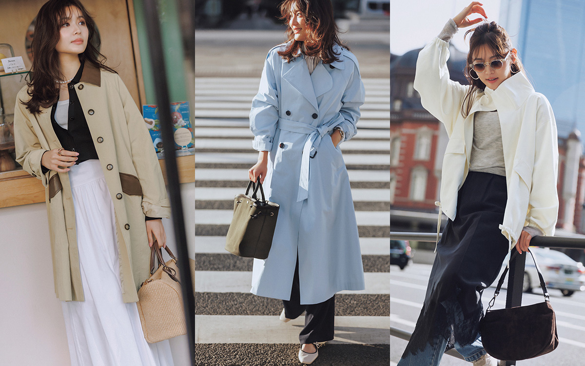定番のロングトレンチは、2枚目を買い足すならきれい色が断然おすすめ! パッと目を引くアイスブルーの華やかさは、ベーシックな小物で受け止めて。