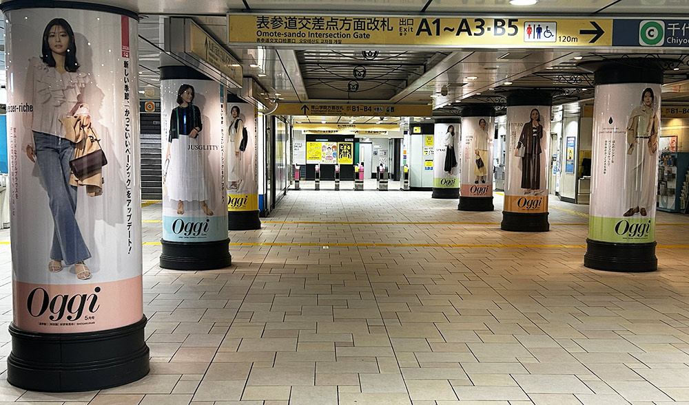 テーマは「新しい季節、〝かっこいいベーシック〟をアップデート!」。高さ約2m×幅約6mの巨大ポスターや11本の柱を埋め尽くすポスター、動画が流れるデジタルサイネージなど、総掲出面は30面!圧巻の表参道駅ジャックは必見です。