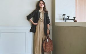 【4/7のコーデ】ベージュワントーンの知的さを黒ジャケットが引き立てる