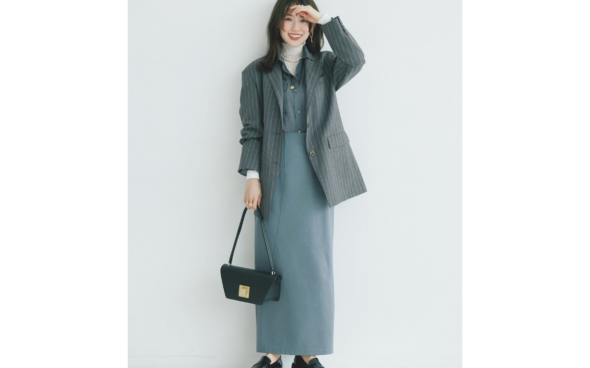 グレーのストライプジャケット×ライトグレーのタートルニット×グレーシャツ×グレーのIラインスカート×黒ローファーコーデ