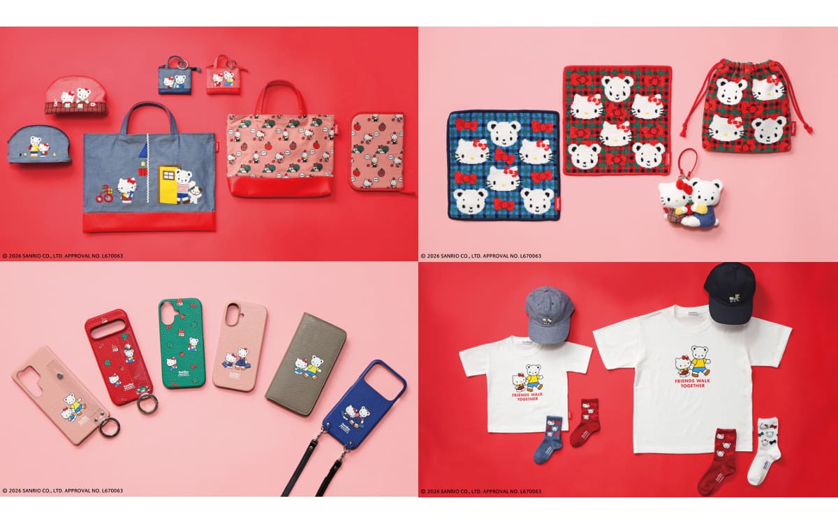 今回のコラボレーションでは、特別なアートを取り入れた計21型のアイテムが登場。ハローキティのアイコンのひとつである「りんご」やファミリアチェックを取り入れたオリジナルカットジャカード生地を使用したバッグやポーチ、4月12日のファミちゃんのお誕生日をお友だちのハローキティがお祝いに訪れ、なかよく過ごす様子をデザインした衣料やステーショナリーなど、幅広いラインナップを展開します。