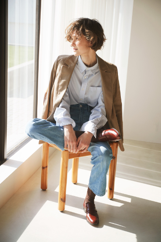 ローファーとのコンビネーションなら、きちんとした印象に。足首の後ろに配されたヤヌークのアイコンでもある「Y」刺繍をさり気なく覗かせて。