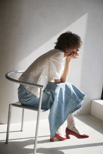 女性らしい透け感は、マニッシュなグレーデニムの足元にもぴったり。たゆませてルーズに履くことで、また違うアレンジを楽しめます。
