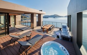特に象徴的なのが、部屋いっぱいの大きさで私たちを出迎えてくれる、大きな窓。眼前に広がる海と、向かい側の島、まさに”ないものはない”をまるごと感じさせてくれる、そこにしかない景色を部屋にいながらにして感じることができます。