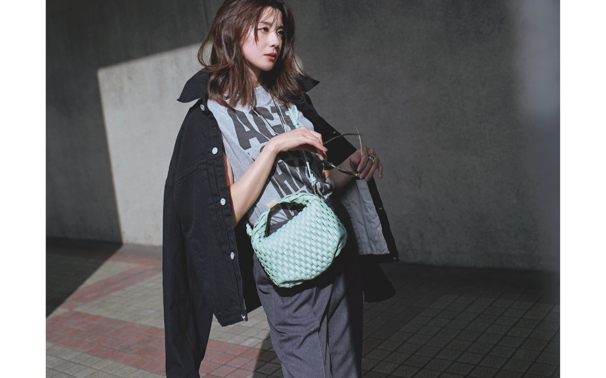 黒×グレーのカジュアルスタイルを品よく盛り上げるミントカラーのバッグ。パステルカラーのアイテムは、いつものコーデに一点加えるだけて「何か変えたい」を叶えてくれる。