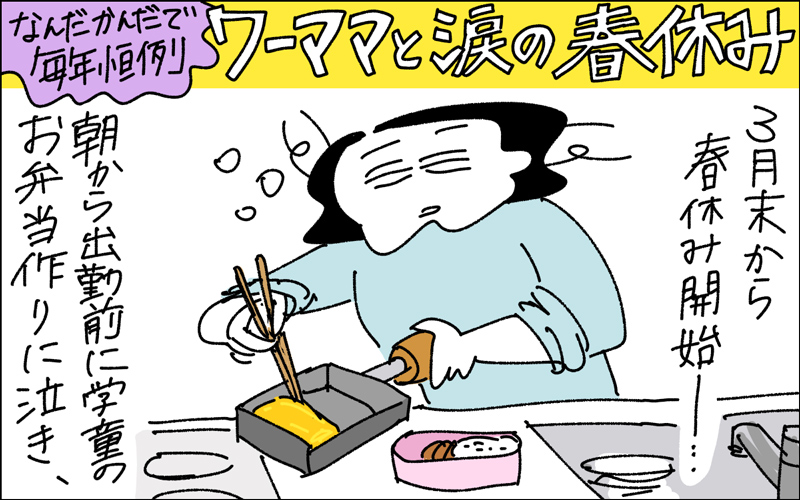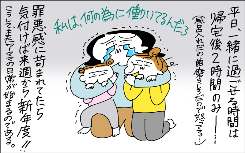 働くママなら誰もが一度は経験したことのある、思わず「わかる~!」と叫びたくなるようなエピソード= 「#ワーママあるある」。自身も2児の母であるイラストレーター・カミナカケロヨンさんがリアルなエピソードを4コマ漫画にしてお届け!今回はせっかくの春休み、働くママの罪悪感について。