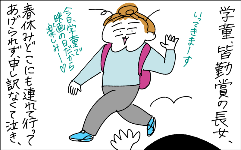 春休みの間、母は当たり前ながら通常業務をこなす日々。せっかくの休みだというのに、学童&保育園で1日を過ごす子供たちに申し訳なさでいっぱい…なカミナカケロヨンさんの思いが綴られています。