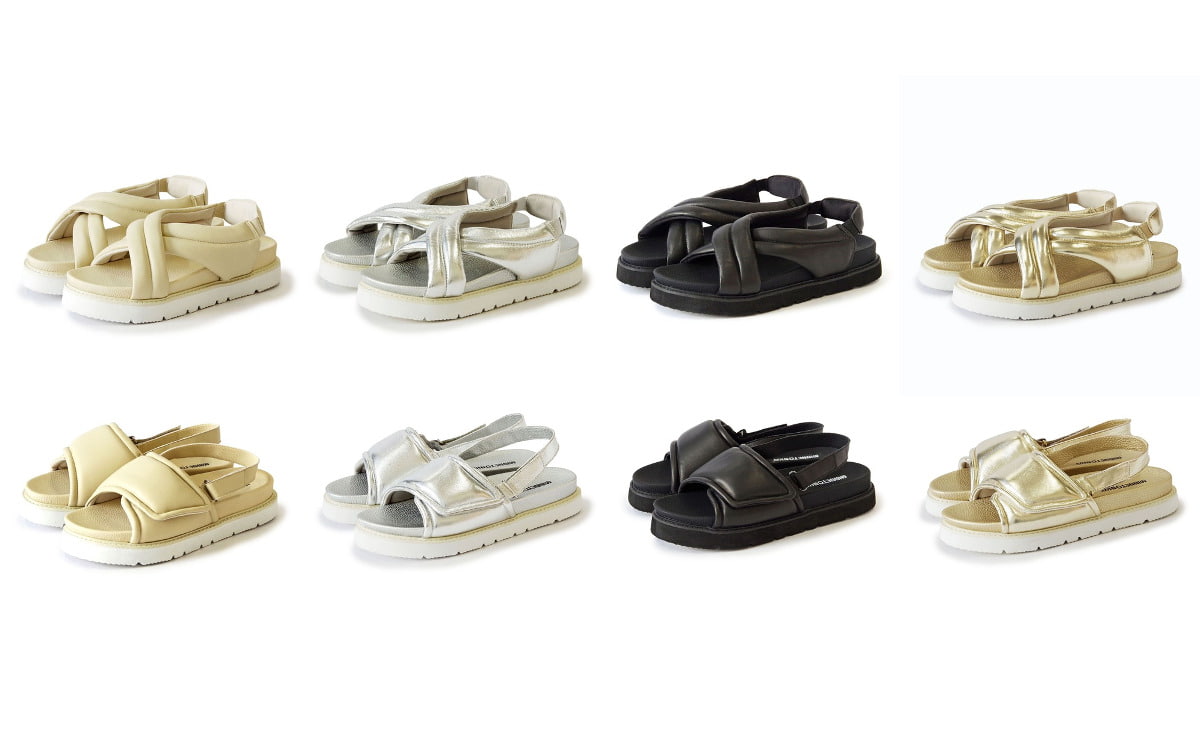 昨年人気だったモデルをベースに、甲部分のホールド感がアップした「クロスベルトパファーサンダル」。アッパーの厚みを、足元が最も美しく見えるバランスかつボリュームが出過ぎないよう設定することで、カジュアルになりすぎない洗練された印象に仕上げています。