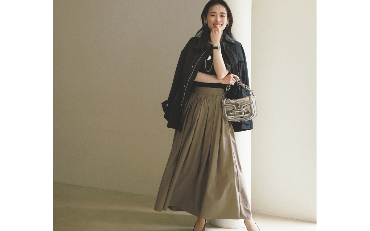 おとなしい印象になりがちなベージュのギャザースカート。地厚なハリ感素材なら、キレよくドラマティック。黒ブルゾンでクールなイメージを補強して。
