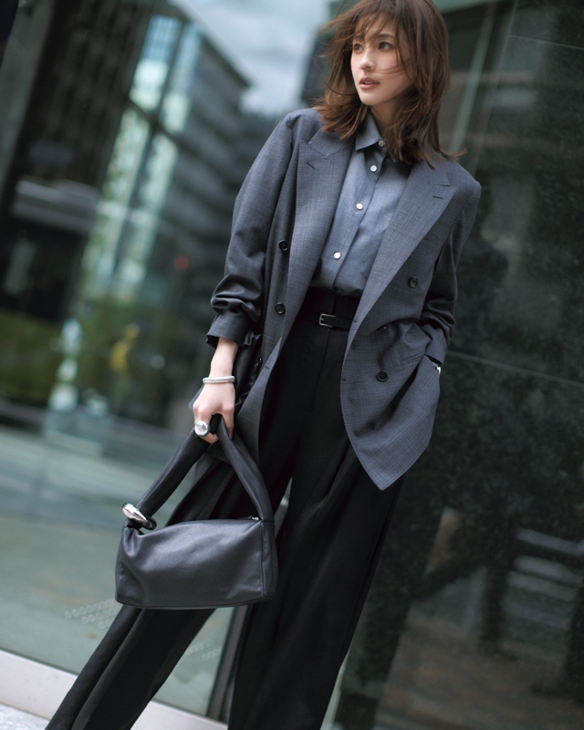 テーラードジャケットにシャツ、ワイドパンツという堅実なアイテムの組み合わせ。ジャケットをオーバーサイズに更新しつつ、メンズっぽい着こなしや配色を意識することで、一層スマートな仕上がりに。