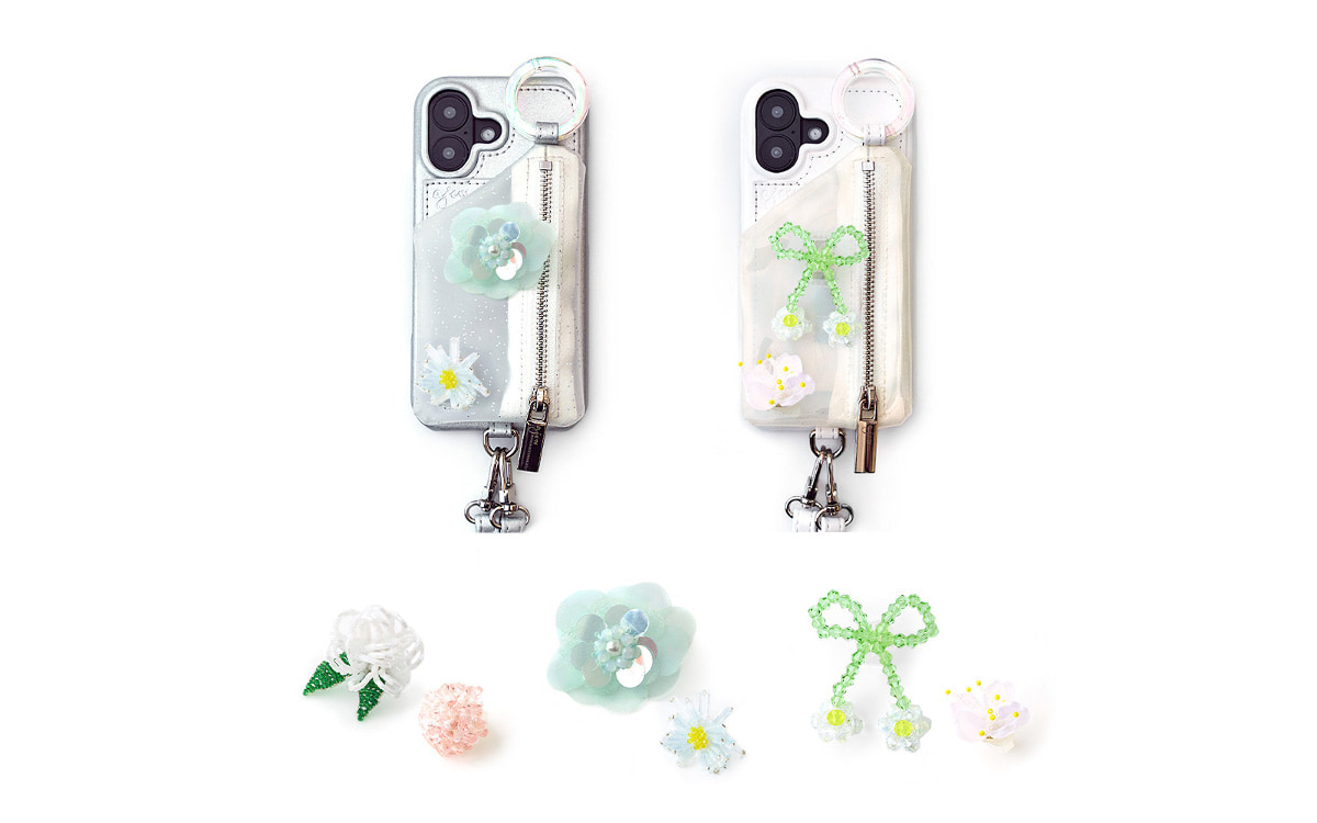 その日の気分やスタイリングに合わせ、ケースに付けるフラワーパーツを付け替えられる「bloom edition case」。ホワイトとシルバーで展開するケースに、ピンクやブルー、グリーンのビーズがきらめく3セットのフラワーパーツをラインナップします。