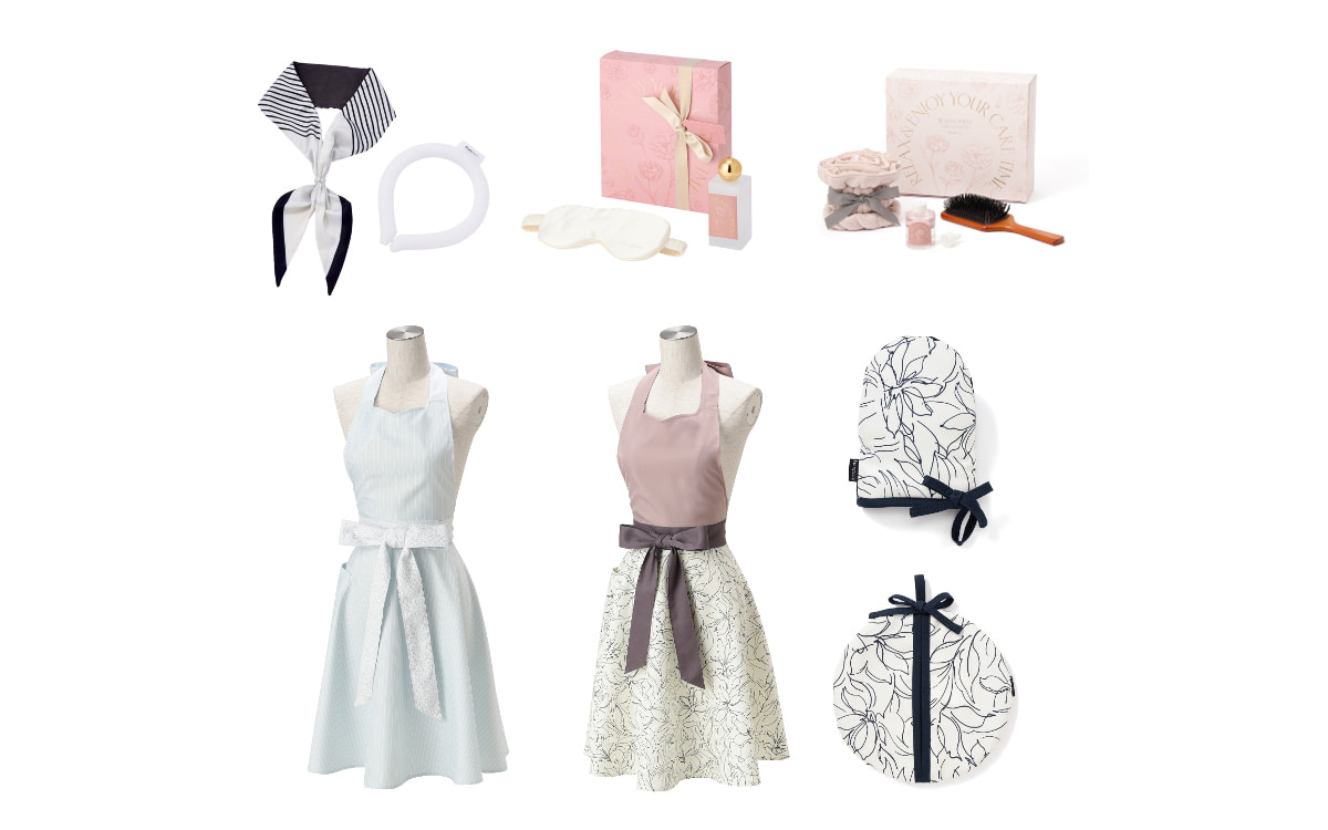 アイスネックループ、スカーフ、スカーフリングの3点セット。ひんやりと心地よいアイスネックループにスカーフを重ね、スカーフリングで簡単に着脱することができます。それぞれ単品で使うこともでき、スカーフは裏側が接触冷感生地なのでそれだけでもひんやり。上品なフラワーデザインのパッケージ入りです。
