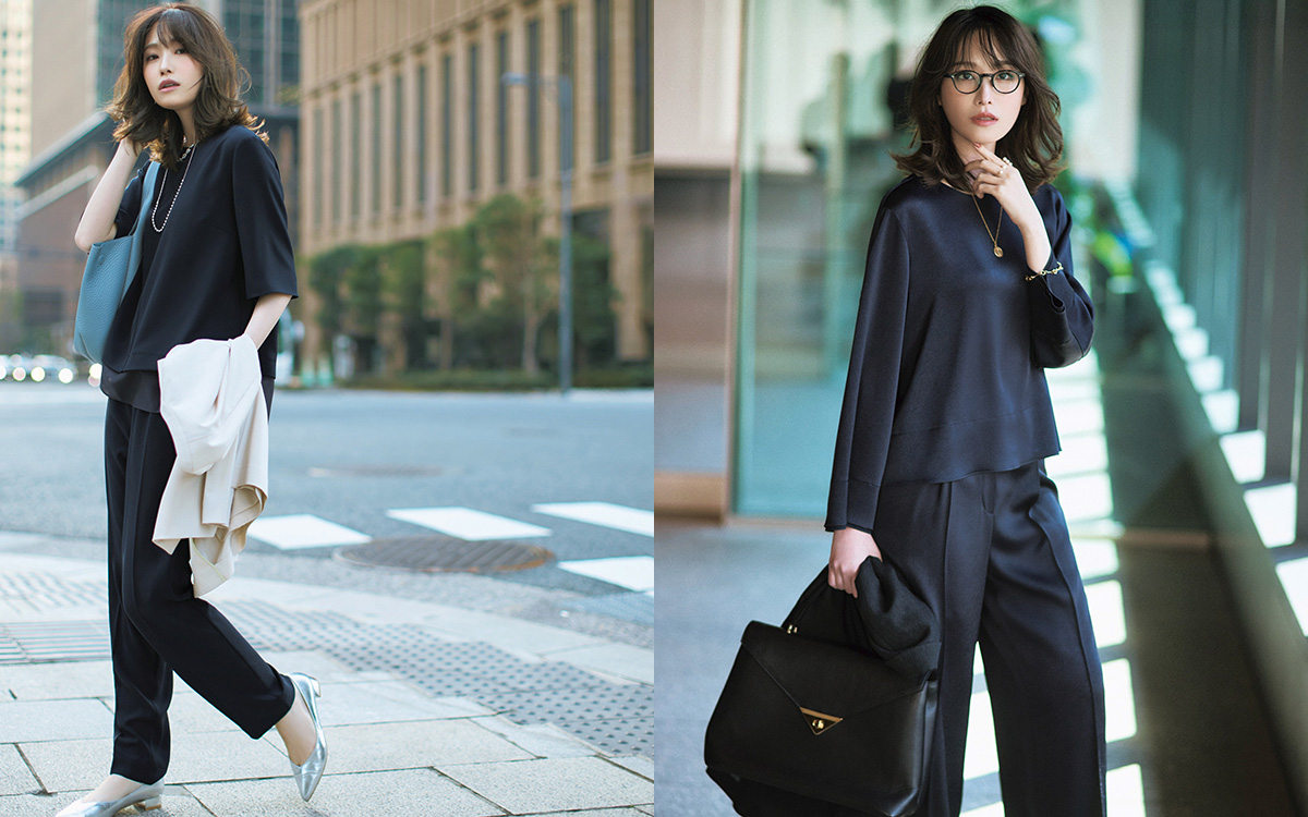 ブラウス¥14,960・パンツ¥18,920(オンワード樫山〈23区〉) 手に持ったジャケット¥24,200(Stola./ストラ) バッグ¥77,000(IACUCCI 大丸東京店〈イアクッチ〉) 靴¥17,050(ダイアナ 銀座本店〈ダイアナ〉) ネックレス[短]¥72,600(マリハ) ネックレス[長]¥44,000(ヴァンドームヤマダ〈エルエーエイチ〉)