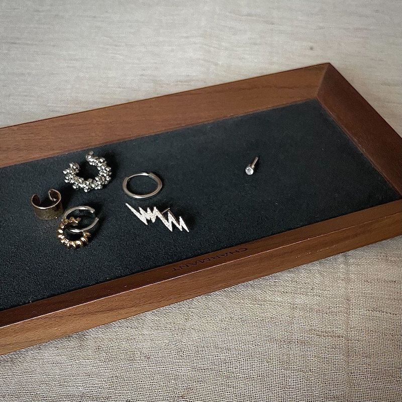 ファーストピアス(画像右)をつけっぱなしにしていた時期に、助けてもらったもう片方のピアスとイヤーカフ。主にシルバーを選んでいて、ピアスはカミナリモチーフやフープといった、あえてまったく違うフォルムのもので、メリハリをつけていました。イヤーカフはさらにゴールド系も加えると、時計やバッグの金具の素材とリンクでき、全体的な統一感が高まりました。