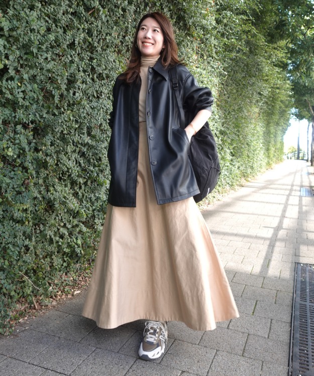 フレアスカートのボリュームがあるので、アウターとリュックを「黒」でまとめてバランスを調整。