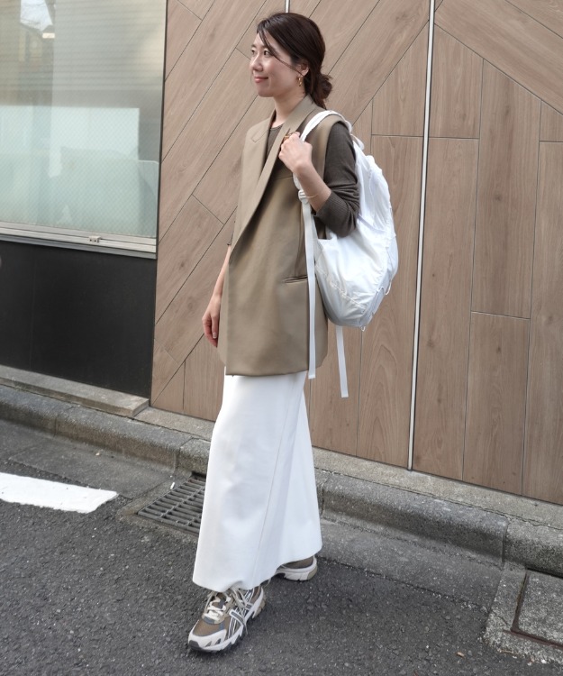 私の定番でもあるベージュ系のワントーンにも、白リュックがきれいめを維持したまま馴染んでくれます。やわらかい色味のワードローブが多い方には、黒よりも白リュクが推せます!