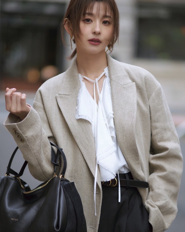 ジャケット¥61,600(HER.) ブラウス¥23,100(サロン アダム エ ロぺ〈サロン アダム エ ロぺ〉) パンツ¥41,800(モールド〈チノ ブラックフォーマル〉) バッグ[参考価格]¥198,000(ザ・ウォール ショールーム〈ネオス〉) ベルト[参考価格]¥28,600(アマン〈アトリエ アンボワーズ〉) イヤリング¥47,300(ブランイリス トーキョー〈ブランイリス〉)