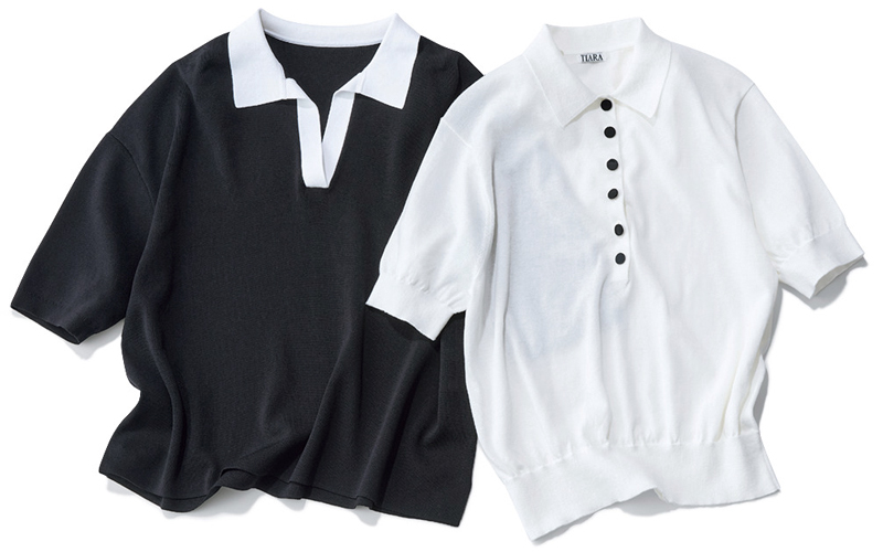 左/バイカラーがアクセントに。キリリとしたスキッパーカラーが、デコルテをきれいに見せてくれる。