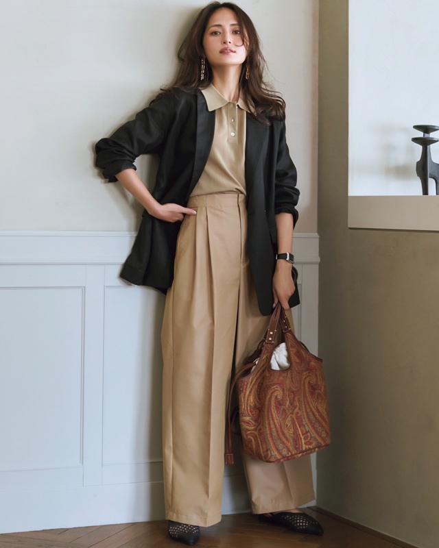 同色ワイドパンツと合わせた、上品なベージュワントーン。黒のジャケットで引き締め、柄バッグを効かせてメリハリを。
