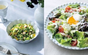 〈Marguerite(マルグリット)〉と〈Daisy(デイジー)〉コレクション、サイズ違いの器を2枚重ねれば、カジュアルなサラダもごちそう感がアップ。