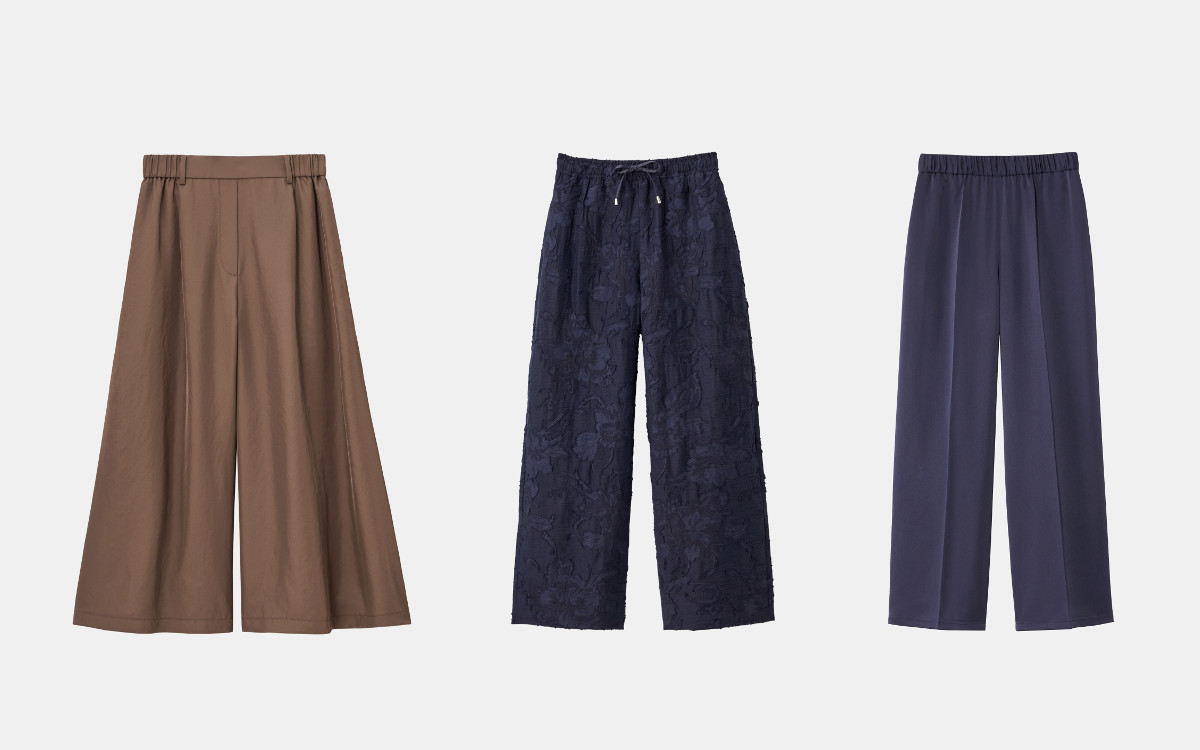 展開されるのは、既存の「サテンイージーパンツ」と新作の「シアージャカードイージーパンツ」、「スウィングイージーパンツ」の3型。オン・オフ問わず着用できる素材やシルエット設計により、イージーパンツの“ラクなはき心地”と“サマになる”きちんとした印象を両立しています。