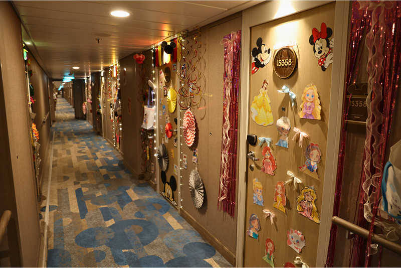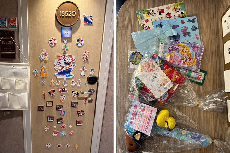 DCLに乗船するのであれば、ぜひ用意したいのが「ドアデコ」と「ピクシーダスト」。「ドアデコ」とは客室のドアをマグネットで自由にデコレーションするDCLならではの文化。もともとは同じ扉が続く中で自分の部屋の目印になるように始まったらしいのですが、今では各部屋が個性を競い合う定番の楽しみになっています。