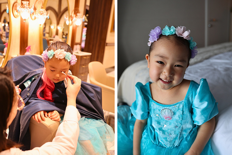 メイクアップとドレスがセットになったフルパッケージがあるのですが、現地ではサイズが欠品しているドレスもあると聞き、我が家はあらかじめ日本でアリエルのドレスを購入して持参。そちらに着替えた上でサロンへ行き、メイクアップ+記念Tシャツのみのパッケージにしてもらいました。