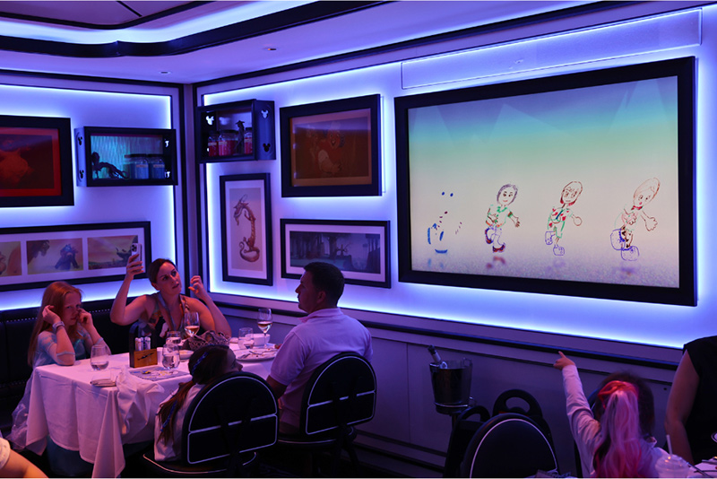 ▲アニメーションをテーマにしたレストランでは、ディズニー映画の名シーンや、自分たちの書いた絵が動き出す様子を眺めながら食事をいただきます。