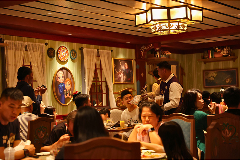 ただし、同じテーマでも例えば「ピクサー・マーケット・レストラン」と「エンチャンテッド・サマー・レストラン」では雰囲気はだいぶ異なりますし、写真のように「エンチャンテッド・サマー・レストラン」にも『アナと雪の女王』と『塔の上のラプンツェル』でエリアが分かれています。好みがあると思うので、指定されなかったレストラン(またはゾーン)には朝・昼食時に足を運ぶとよいでしょう。