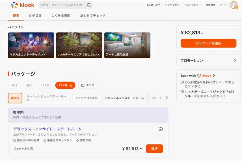 アドベンチャー号の予約はだいたい1年半以上先まで予約ができるようで、半年を切ると値段の安い客室から埋まっていく傾向にあるようです。自分も狙っていた日程がDCL公式サイトだと満室だったのですが、世界中の観光・交通・通信・宿泊を予約できる旅行・体験予約アプリ「Klook」から検索すると、なんと空室があり予約することができました。