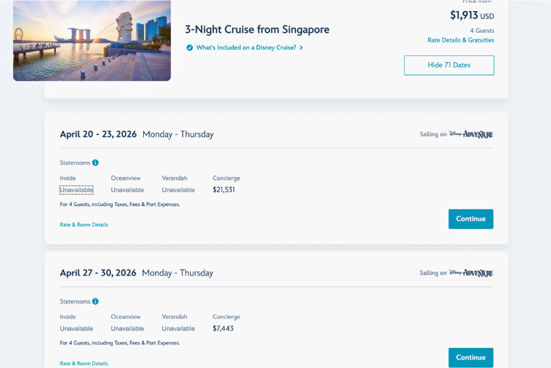 ▲公式サイトで検索すると、2026年4月27日発3泊クルーズはコンシェルジュ付き客室以外、すべて満室でした(2026年4月8日時点で検索)。