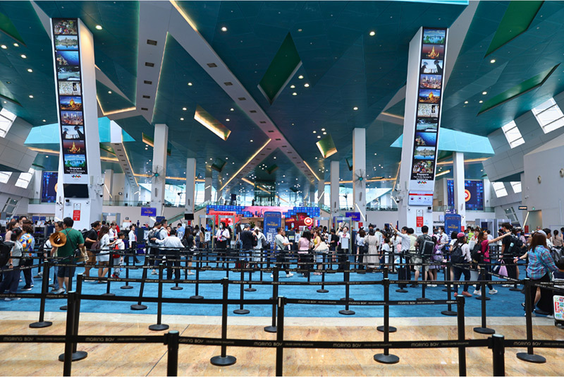 ▲マリーナ・ベイ・クルーズ・センターでの乗船手続きの様子。スーツケースは別の場所で預け、乗船後に部屋の前まで運んで来てくれるのでスムーズです。