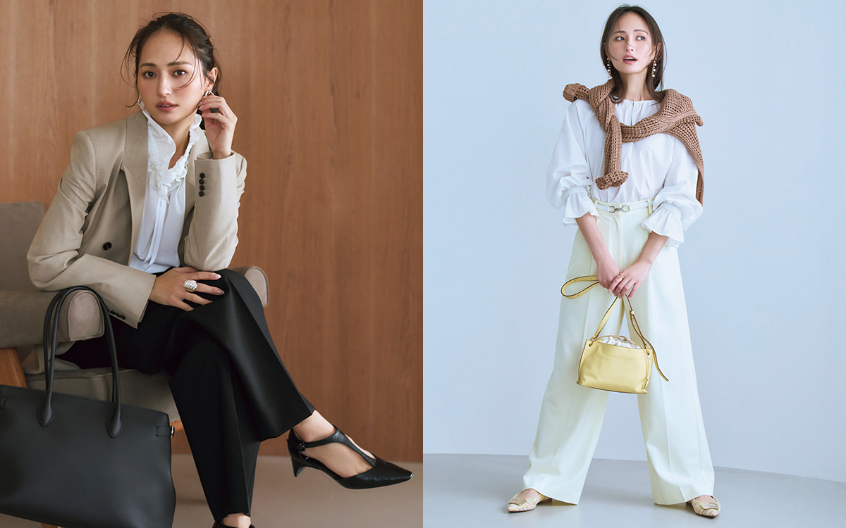 ブラウス/着回し ジャケット¥27,500(ánuans) パンツ¥74,800(イレーヴ〈イレーヴ〉) バッグ¥385,000(ボナベンチュラ〈ボナベンチュラ〉) 靴¥183,700(ピエール アルディ 東京〈ピエール アルディ〉) ピアス¥33,000(ブランイリス トーキョー〈ブランイリス〉) リング¥22,000(フーブス〈IRIS47〉)