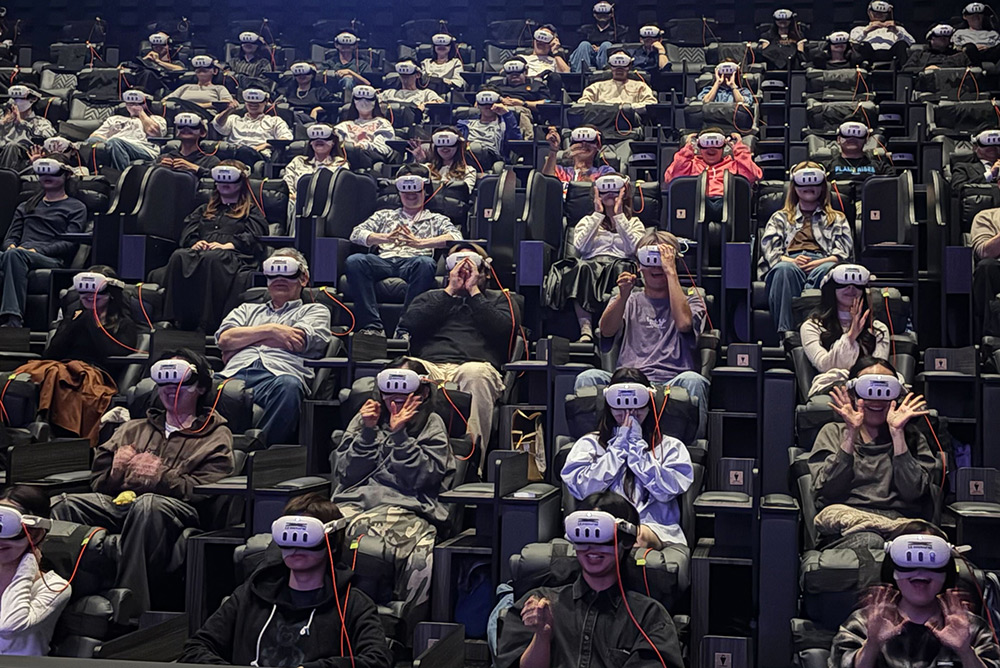 ヘッドセットをつけ準備が整うと、メンバーを1人選ぶことができます。ここで選んだメンバーが都度都度、近づいて来てくれるターンがあるので、しっかりと心の準備を。筆者はVRコンサートを何度か体験しているにも関わらず、何度観てもVRだと、メンバーが登場した瞬間から「近い、近すぎる!ビジュアルが強すぎる!スタイルが良すぎる!」という圧倒的な美におののきます。「顔、ちいさ…」と思わず声がこぼれてしまうほど。ちなみに周りで見ている試写に参加していたFEARNOT(LE SSERAFIMのファンの呼称)も同じ反応で、あちこちから「すごい」「信じられない」などと驚きや喜びの声が上がっていました。