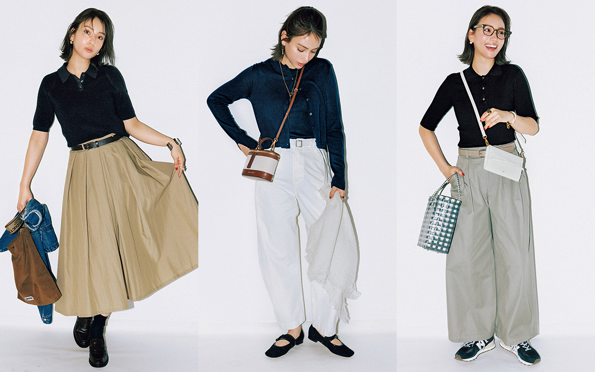 コットンパンツやスニーカーなど「いつものカジュアルアイテム」も、ポロニット合わせなら感度高めに。ウォレットバッグとプラかごバッグの2個持ちで遊び心を加えるのも効果的。