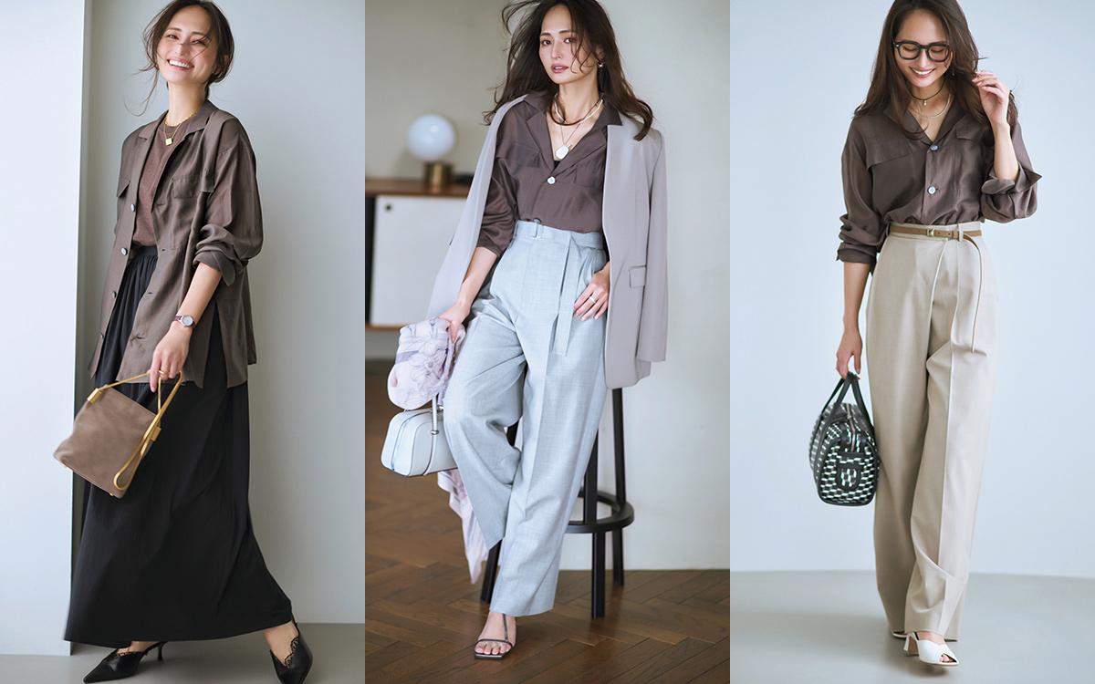上品なブラウンシャツとベージュのラップパンツでつくる洗練されたシンプルベーシックを、存在感のある太ブチメガネ、柄バッグで外せば、こなれて見える。