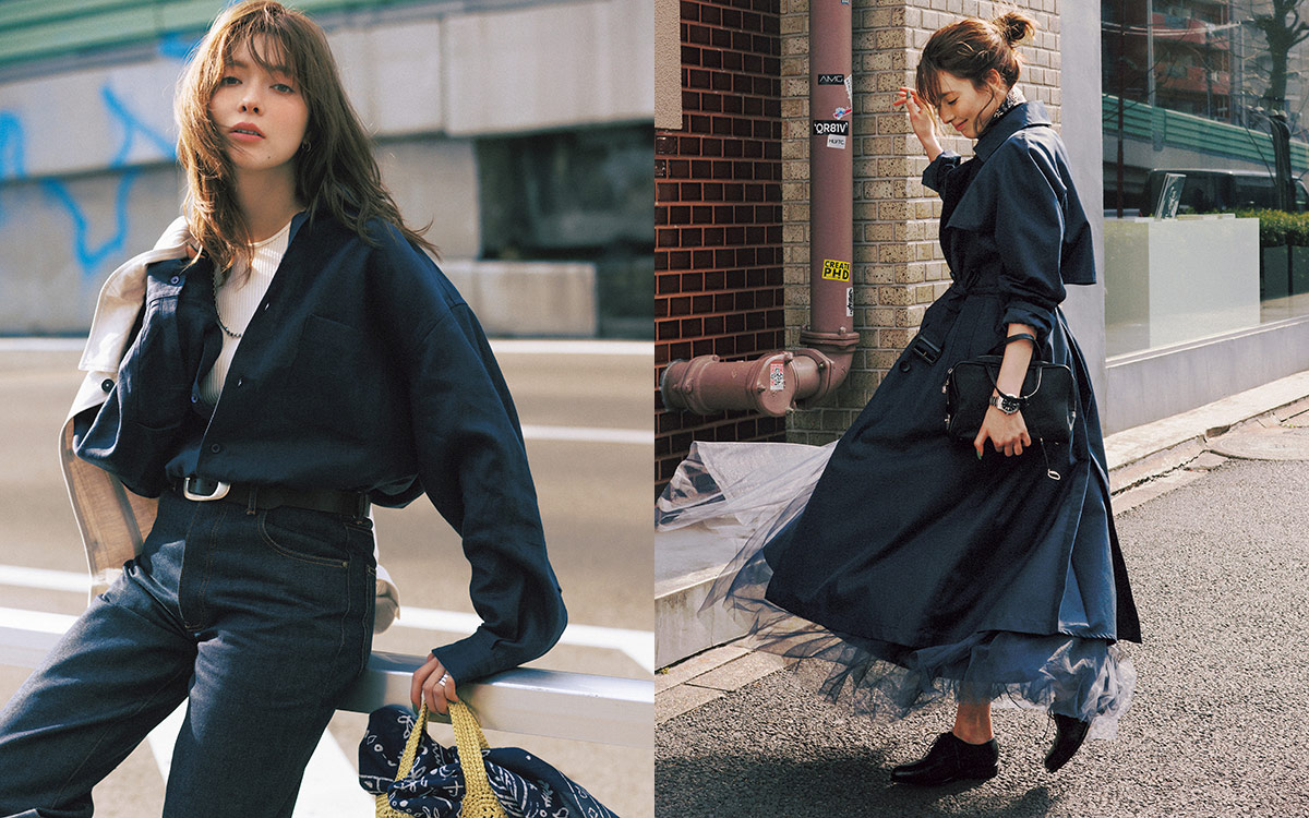 ハリ感のあるロングトレンチの裾から、チュールレースのスカートをのぞかせて。テイストの異なるアイテム同士も、ネイビーの洗練イメージが落ち着いた印象にまとめあげてくれる。バンダナ柄のスカーフやレースアップのレザーシューズ…マニッシュな小物使いもネイビーの服で受け止めると洒落感がより際立つ。