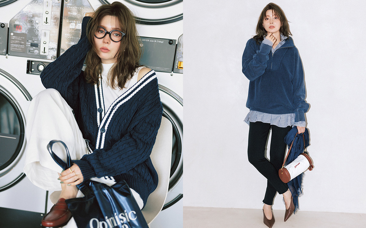 トレンドのハーフジッププルオーバーは、メンズ風味のネイビー&たっぷりしたサイズ感を選ぶとかえって華奢なイメージが高まる。黒スキニーとポインテッドパンプス…シャキッとした’80年代風の足元が新鮮。