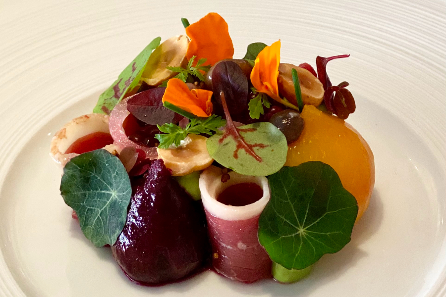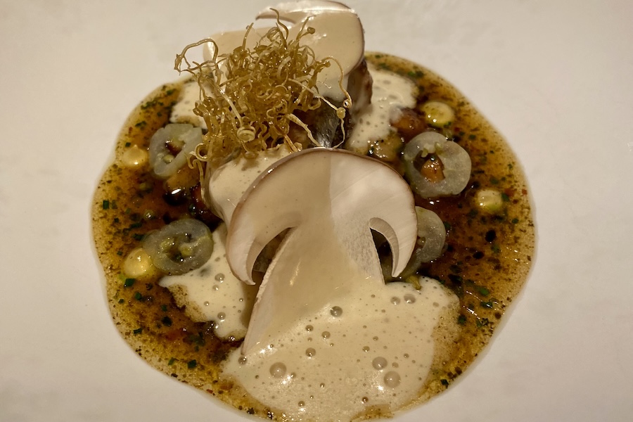 素材を生かした奥行きのある味わいで満足度の高いコースが魅力。地下のキャビネットで育てた自家栽培のキノコや、日本の食材を取り入れた一皿も印象的です。