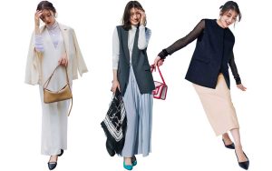 袖ありだとメンズライクに見えるビッグシルエットも、袖なしデザインならしなやかで女性らしいムードに。ロング丈のジレはきちんと感を牽引し、甘め黒の引き締めにも!