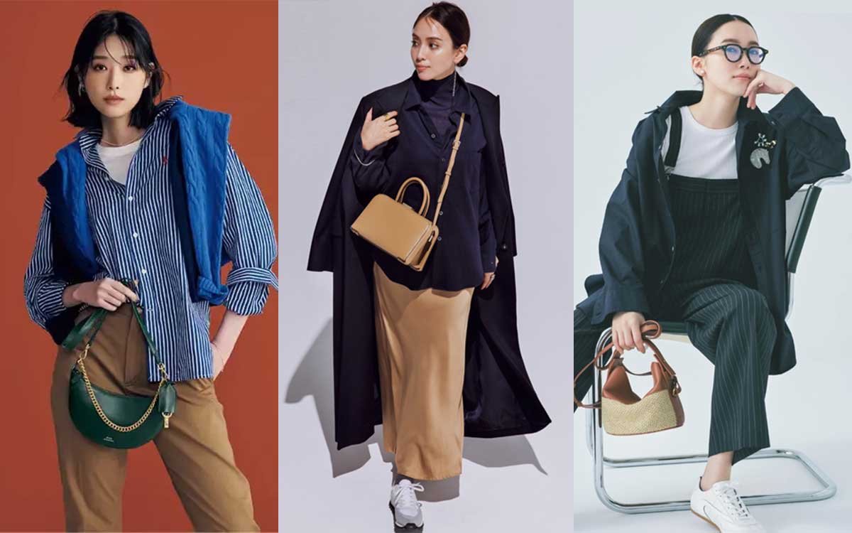 ネイビーブルーが映える、端正なストライプシャツを主役に。全体をディープなカラーでまとめ、秋ムードを深めたい。ミニマルでスマートなデザインのバッグで、装いをキリッと引き締めて。