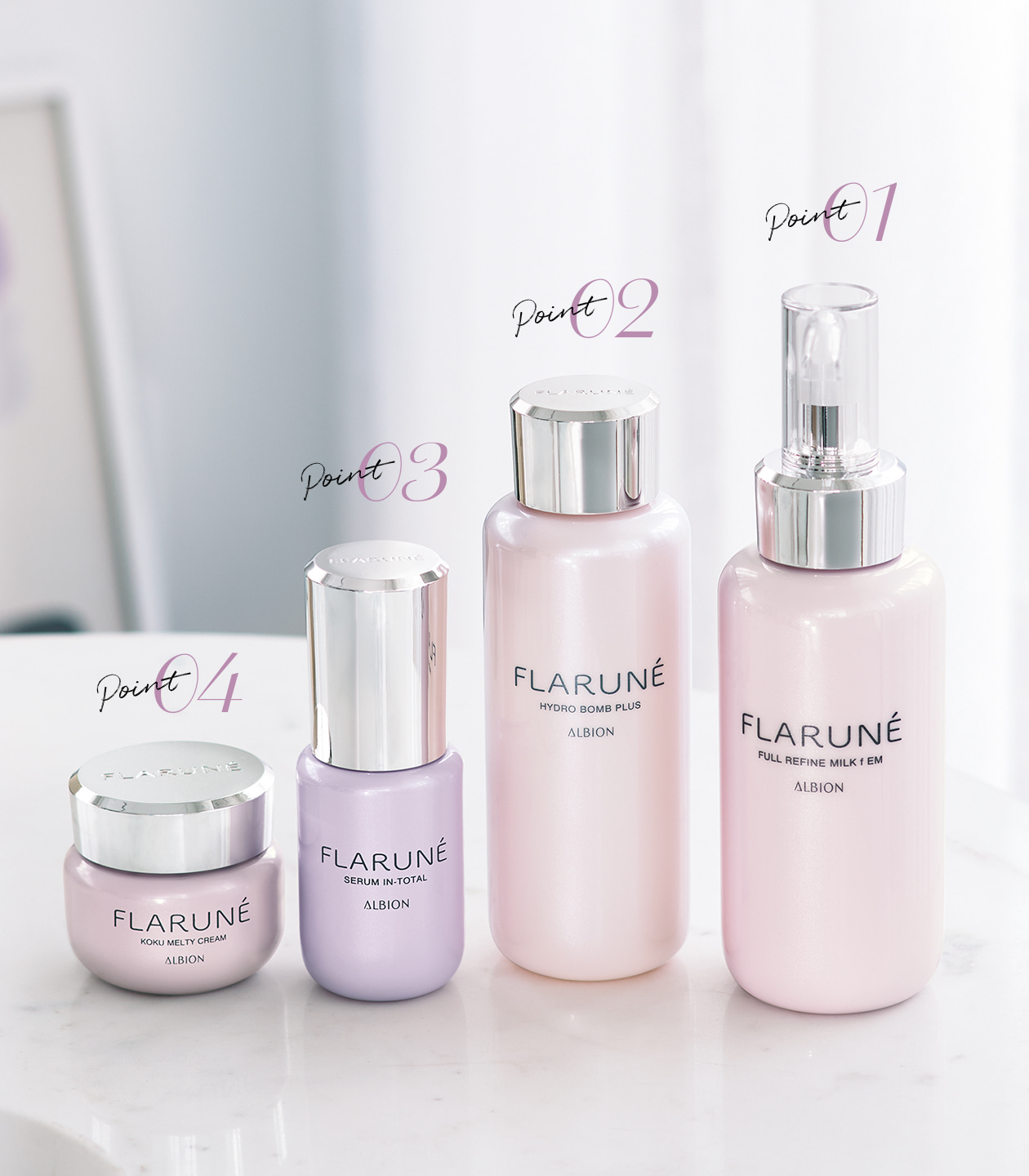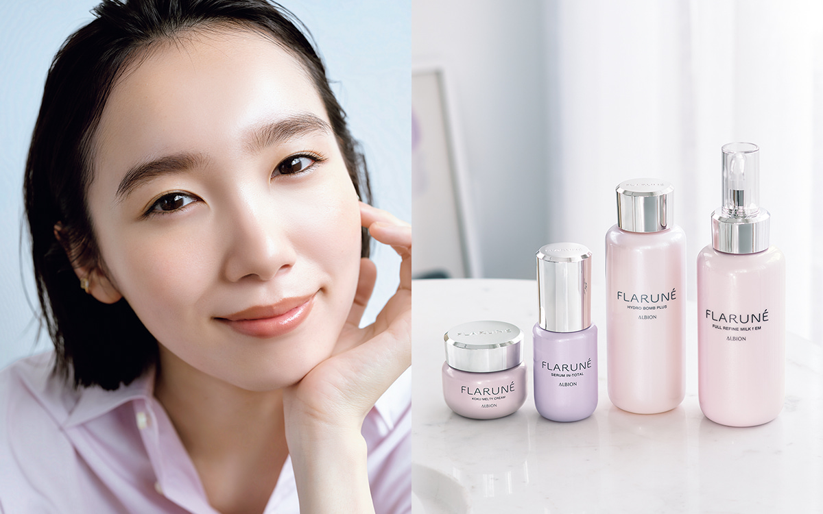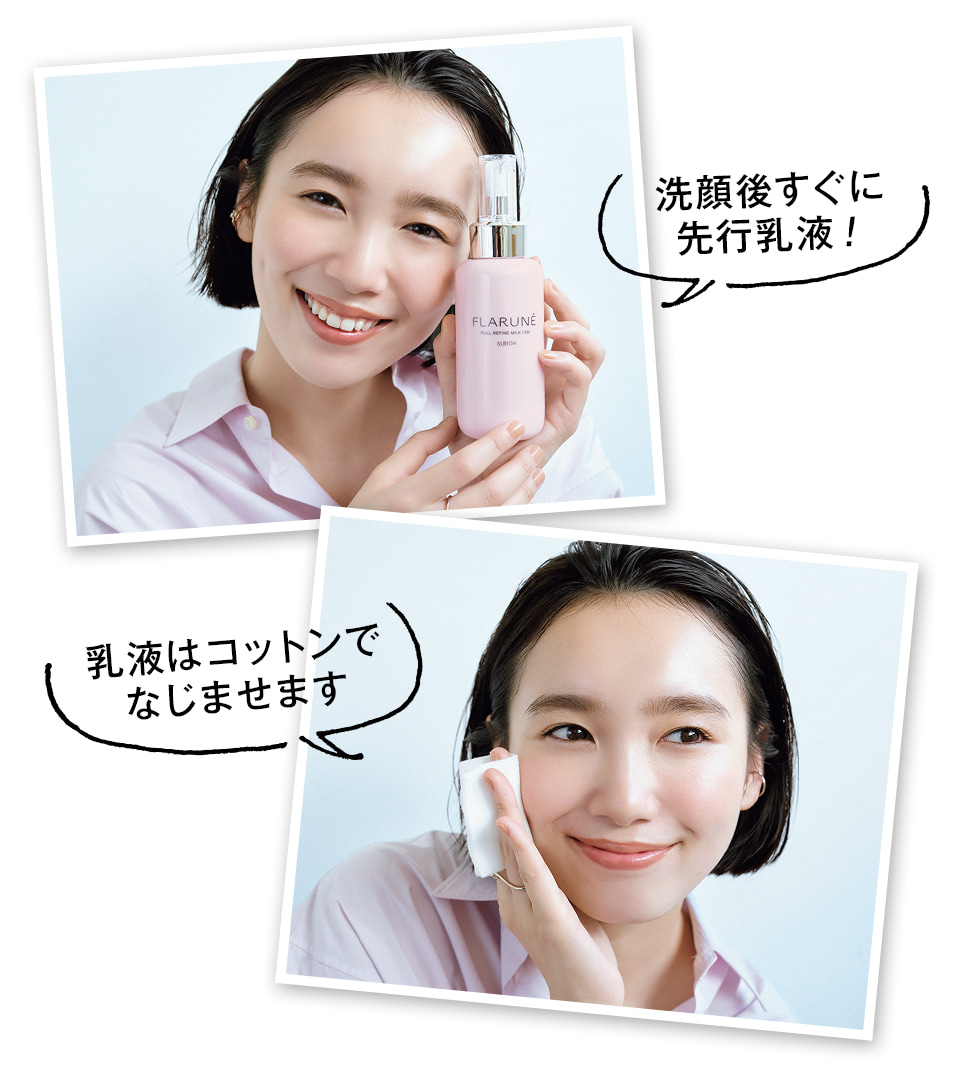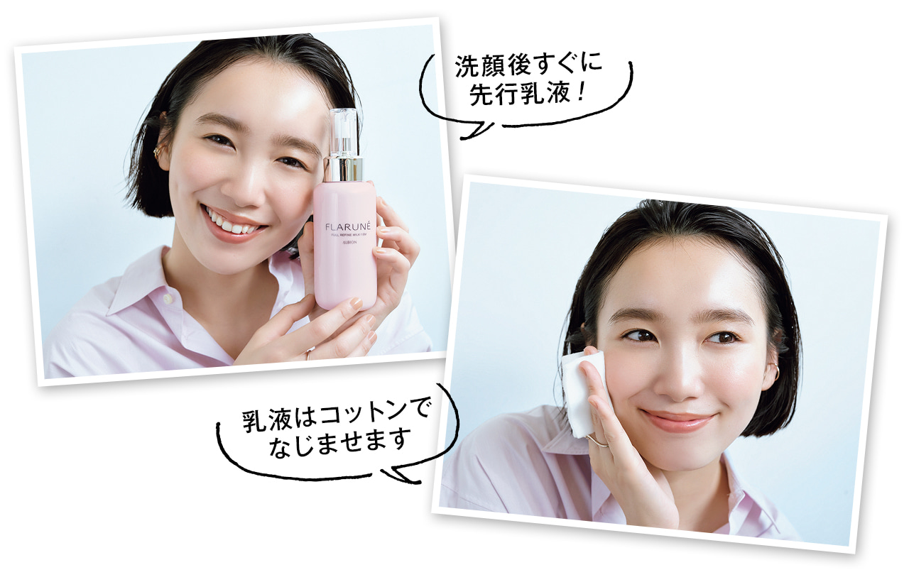 「今年の夏はロケ撮影の機会も多かったので、いつも以上にきちんとお手入れすることを意識していました。洗顔後すぐの肌に乳液をなじませる先行乳液ケアが私には合っているみたいで、ふわっとやわらかくなり、次に使う化粧水もなじみやすくなるのが好きです」そう話すまりえが、アルビオンの最新美容研究に基づいて進化した『フラルネ』のライブリーラインにトライ。