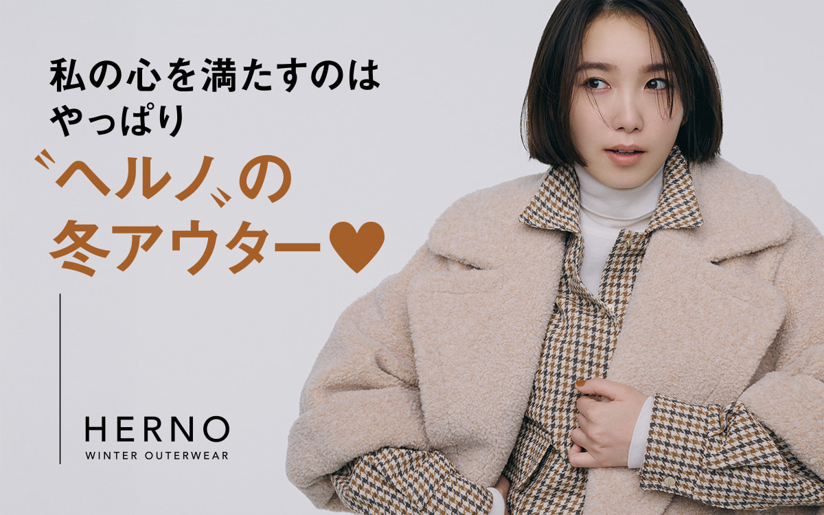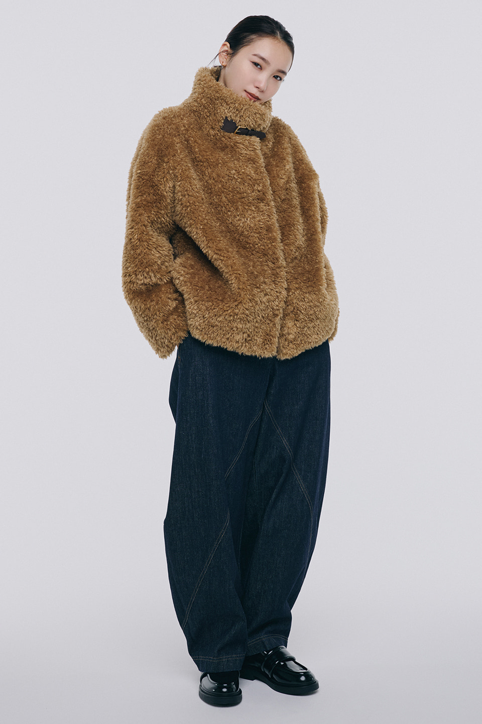 カーリーなエコファーブルゾンは、明るいキャメル色も相まって、ひと目ぼれ必至のチャーミングさ! ふんわりとした肌触りが最高に心地よく、着るたびに幸せな気持ちを運んできてくれること間違いなし♡ レザーベルトが施された高めのスタンドカラーは、冷気をシャットアウトしながら、着こなしのアクセントとしても存在感を発揮。ライニングには〝ヘルノ〟のシグネチャーであるHモノグラムがあしらわれ、たとえば、レストランなどでアウターを預けるシーンでも自信がもてる。ボトムにはブランド初お目見えのデニムパンツをチョイス。立体的なバレルシルエットのデニムが、リラックスムード漂うエコファージャケットと完璧にマッチ! ワンランク上の大人カジュアルへと導く。