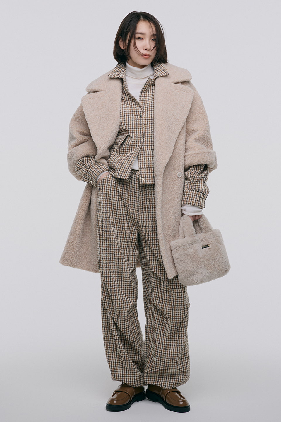 もこもことした風合いにひかれるエコファーコート。軽量ポリエステルを使用することで、驚くほど軽やかな着心地を実現! もちろん暖かさも十分で、毎日のように袖を通したくなりそう。ゆとりのあるシルエットを描くダブルブレストや、ドロップショルダー&ロールアップデザインの七分袖のおかげで、多彩なレイヤードを楽しめるのも魅力。また、ひざ上のミドル丈ゆえ、身長を問わずバランスが取りやすいのもうれしい。柔和なアイボリーカラーと大きめのラペルからは品のよさがさりげなく香り、ラフにはおるだけでさまになる。千鳥格子柄のハンサムなセットアップを合わせて、小粋な着こなしに。