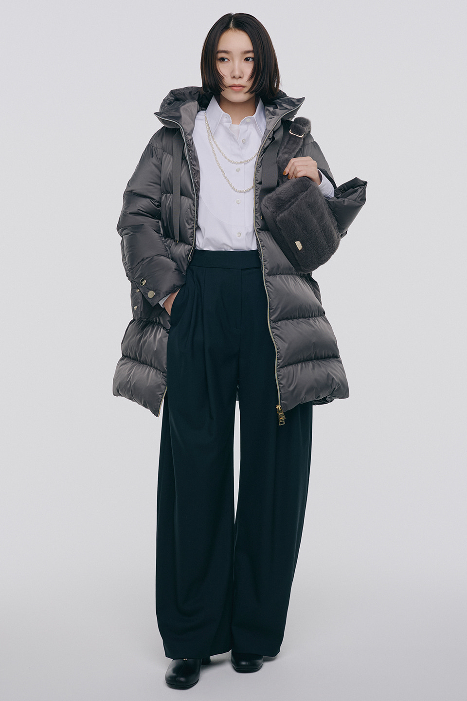首元で揺れる幅広のグログランリボン、袖口に配された大きめのメタルスナップボタン、フロントで輝くボリューミィなジップスライダー…。華やかなディテールがセンスよく効いたダークグレーのダウンコートは、周りと一線を画す一枚。中綿はダウン80%、フェザー20%と高品質で、軽さと暖かさを堂々と両立! さらに、撥水加工を施した高密度なポリエステル素材を使用しているため、多少の雨雪ならOKなのも頼れる理由。クリーンな白シャツとシルエットの美しいウールツイルパンツに合わせて、ちょっとモードに振ると新鮮。
