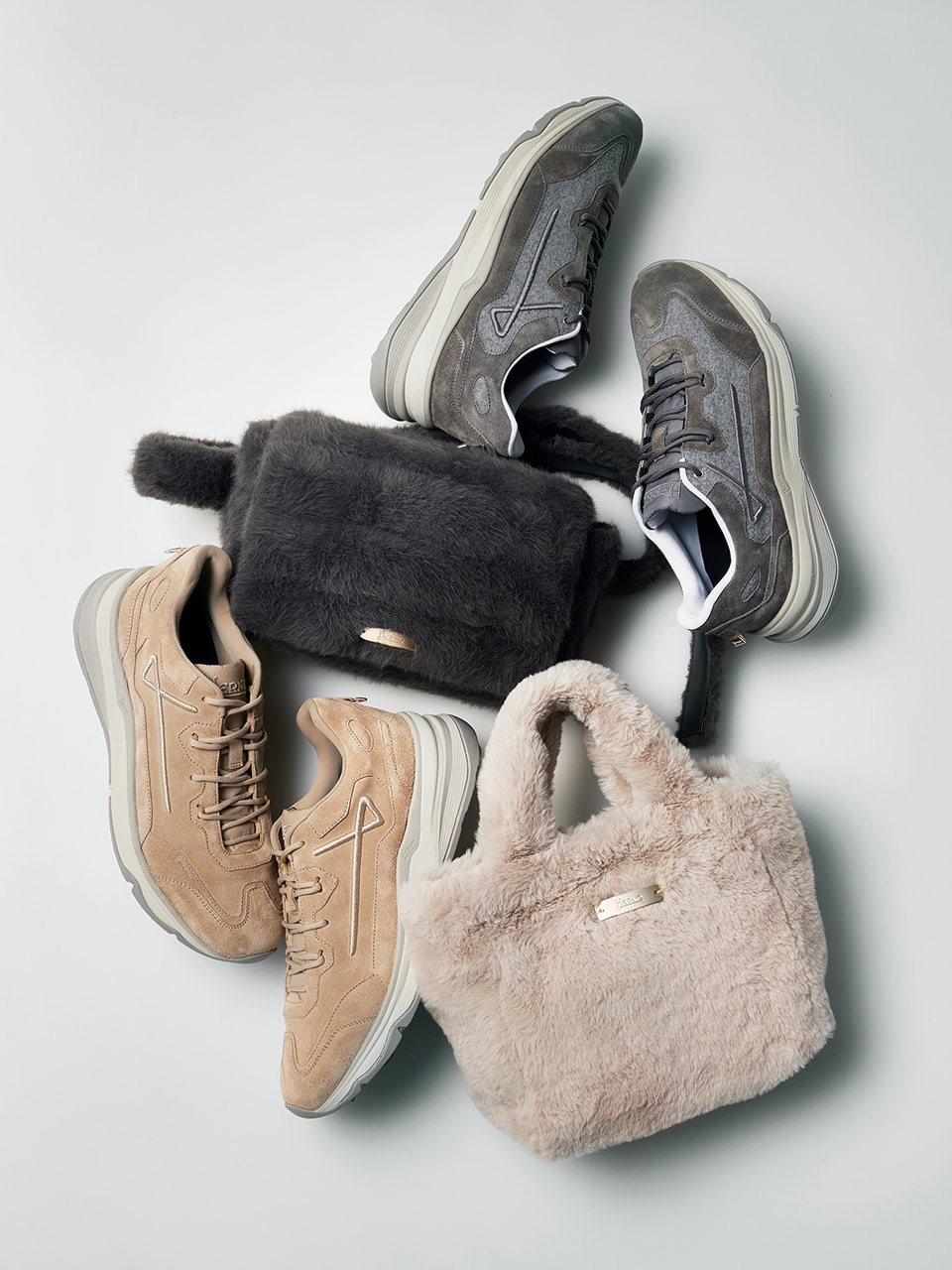 スニーカー[ヘルノ マッジョーレ/ヒール4.5cm]各¥107,800・バッグ[上/縦13×横23×マチ7.5cm]¥132,000・バッグ[下/縦20×横27×マチ11cm/ポーチ・ショルダーストラップ付き]¥59,400(ヘルノ・ジャパン〈ヘルノ〉)